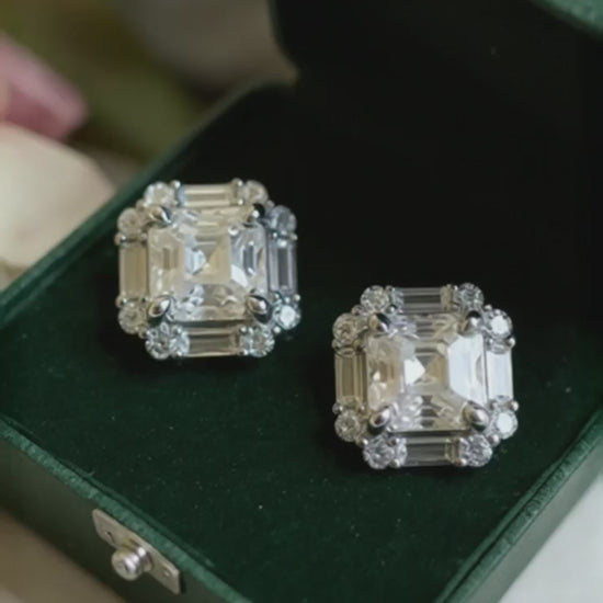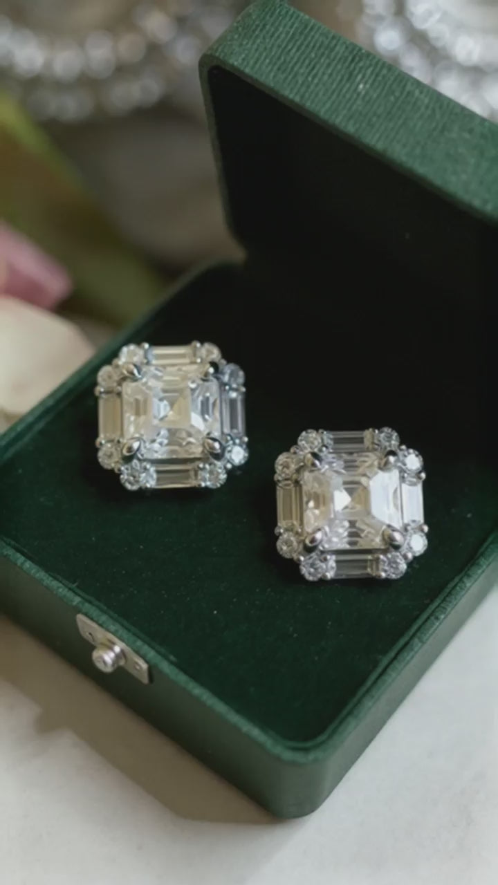 At the heart of each earring rests a 1-carat square-cut moissanite, distinguished by its VVS1 clarity, D color grade, and an impeccable cut a reflection of precision and excellence. Set in luminous 925 sterling silver, the composition balances modern refinement with enduring grace.