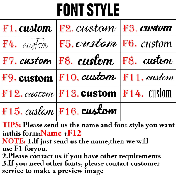 When placing your order, please include the custom name (15 Characters Max) and birth month you'd like engraved in the notes at checkout. If we don’t receive it within 24 hours, we’ll default to engraving the recipient’s name in Font F1 and assign the corresponding birthstone.